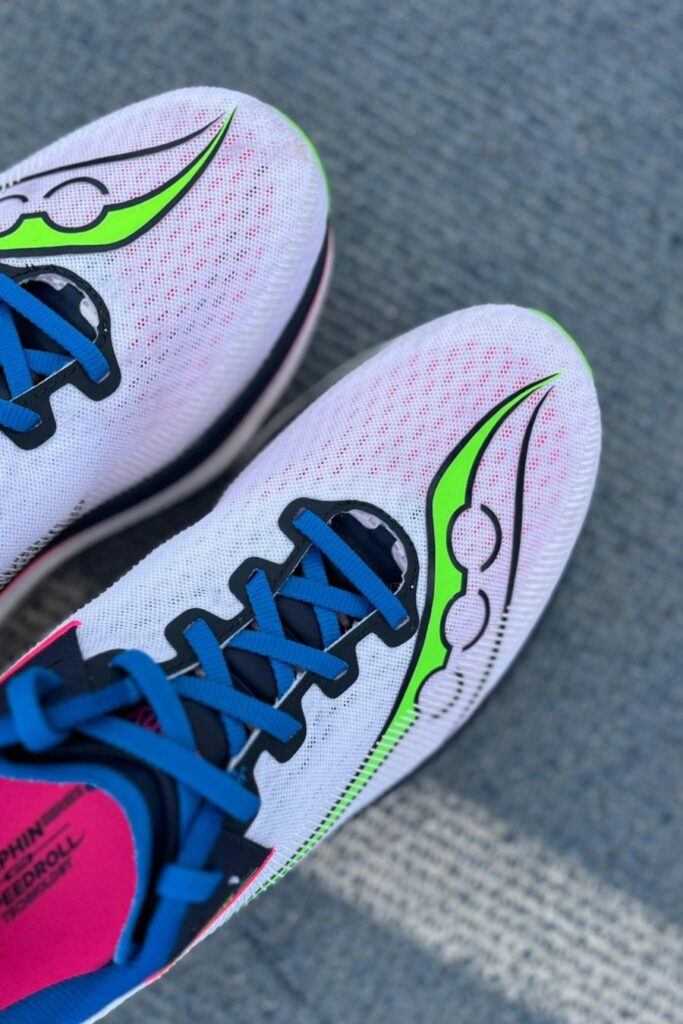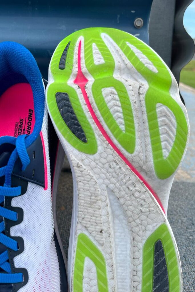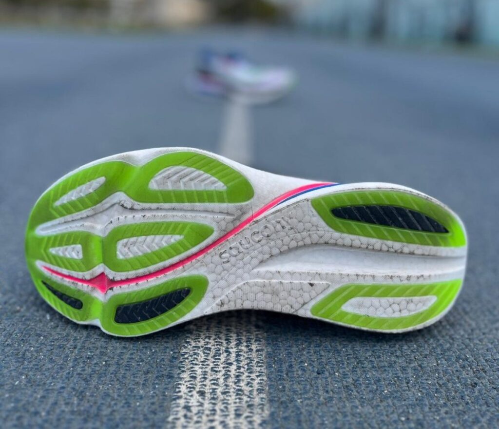 En el caso de las Saucony Endorphin Azura, estos están bien marcados tanto en talón como en punta. Con 40 mm detrás y un drop de 8 mm, el biselado y el rocker trasero ayudan a suavizar el aterrizaje de talón, evitando que se sienta brusco o plano y favoreciendo una transición más fluida hacia apoyos adelantados. Esto reduce la sensación de “torpeza” que podría generar un perfil tan alto.